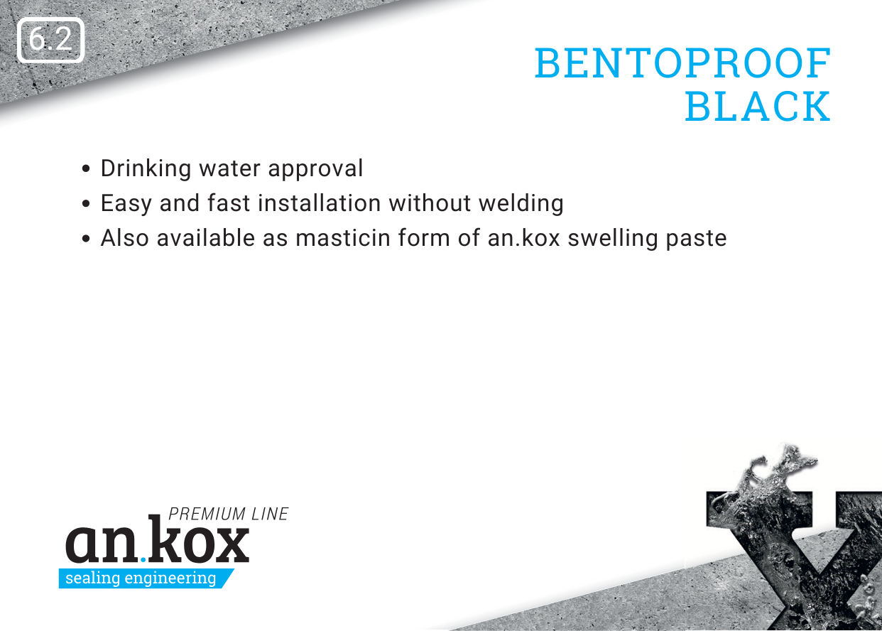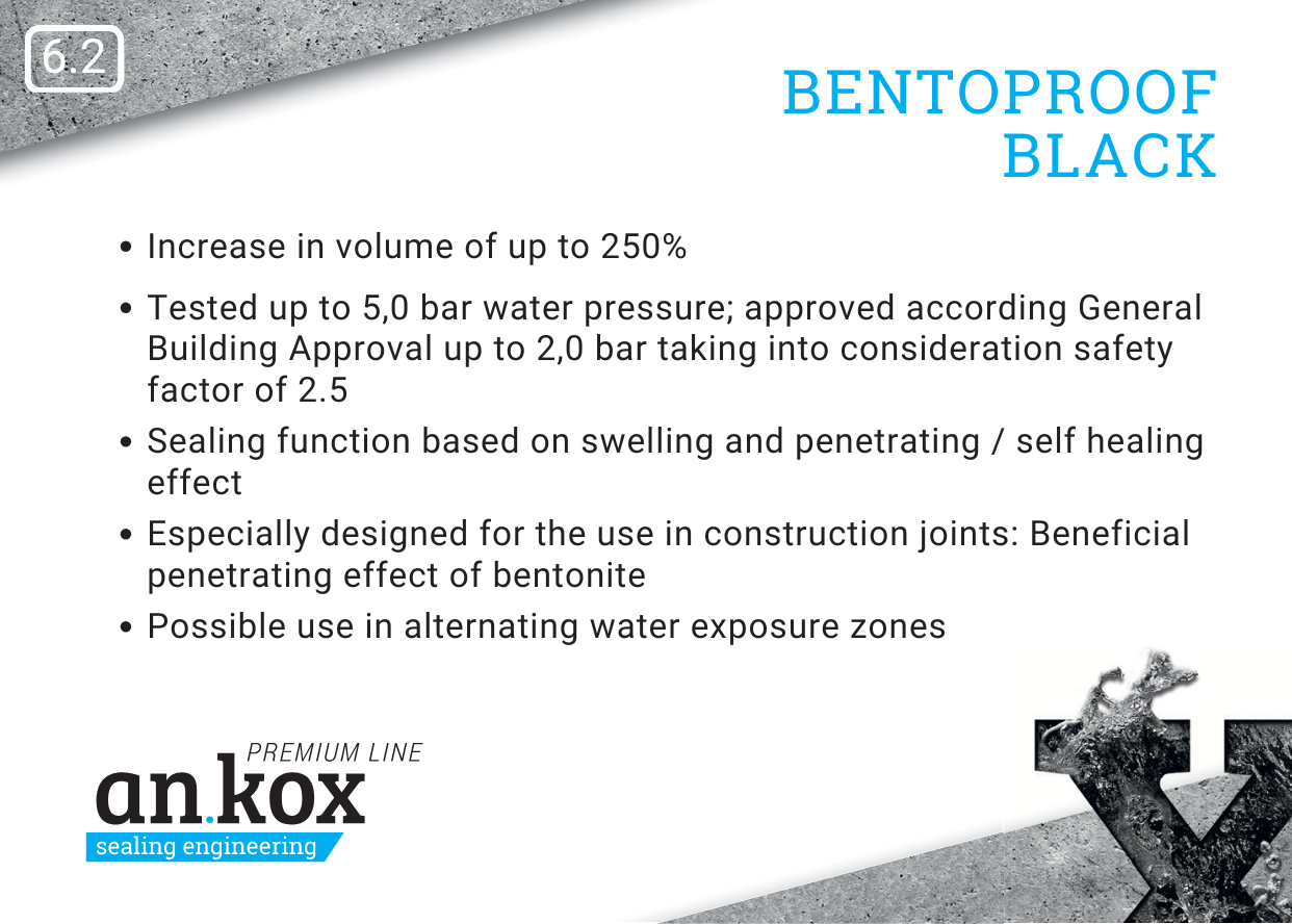 Made of a sodium-bentonite-based material, its solid structure turns into a plastic compound on contact with water allowing it to penetrate fine cracks and cavities. Even after numerous wet/dry cycles, Bentoproof black retains its full waterproofing capabilities.