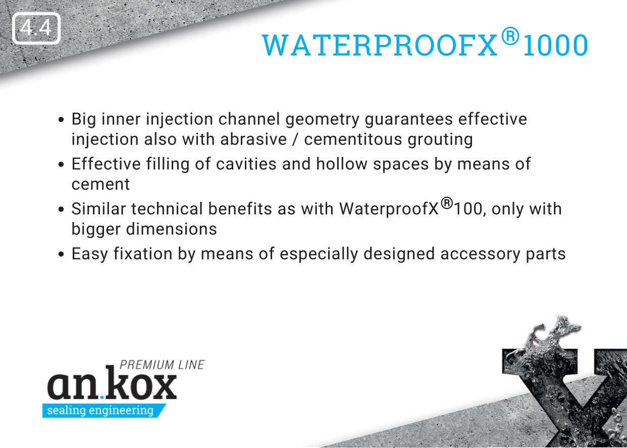 Due to its much larger inner cross-section, WaterproofX® 1000 is particularly suited to technically challenging injections with abrasive, mineral-based grouts. Apart from its sophisticated inner and outer geometry the advantages of this system are on par with its small role model: the WaterproofX® 100.