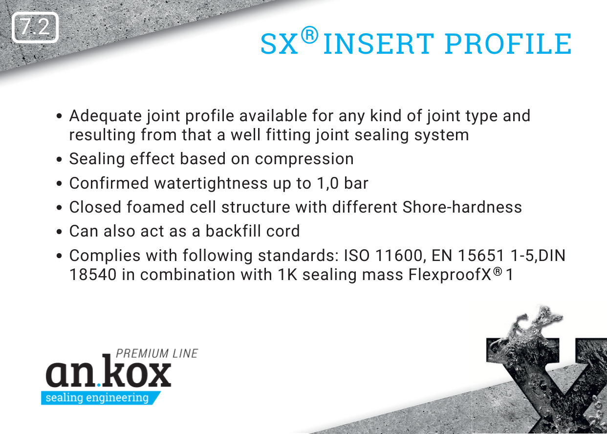 SX® Insert Profile is frequently used as a sealing and backfill profile in combination with our one-component sealing compound FlexproofX® 1. Installation takes place in accordance with DIN 18540-F.