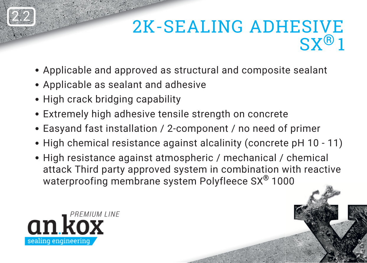 2K Sealing adhesive SX® 1 adheres extremely well to mineral substrates. Once hardened it is vapour permeable and can bridge cracks. It remains impermeable for chloride, is frost-proof and highly resistant to aging.