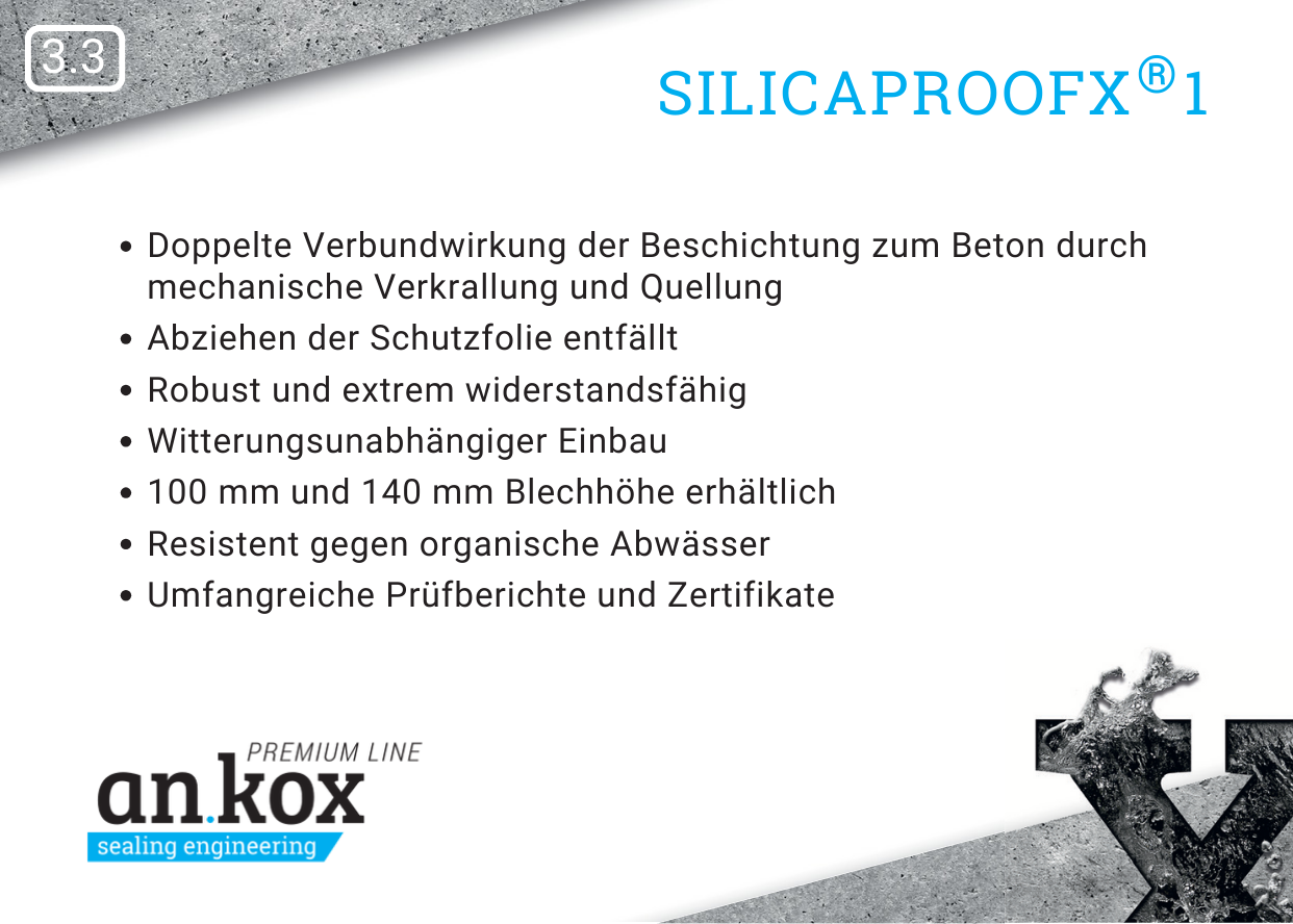 SilicaproofX® 1 ist ein innenliegendes, einseitig vollflächig beschichtetes Fugenblechsystem zum einfachen, schnellen und sicheren Abdichten von Arbeitsfugen. Das innenliegende, beschichtete Fugenblech weist eine einseitige Beschichtung auf, die sich während des Aushärteprozesses des Betons mit dem Frischbeton mechanisch verbindet und deren Polymerlage unter Feuchtigkeitseinwirkung quillt. Dadurch ist eine doppelte Abdichtungsfunktion (= doppelte Sicherheit) bei der Abdichtung von Arbeitsfugen gegen drückendes Wasser gegeben.