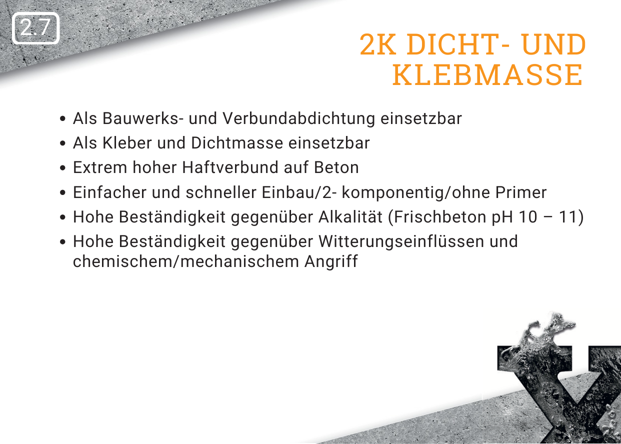 Sie wird aus zwei Komponenten gemischt und haftet hervorragend auf mineralischen Untergründen. Fachgerecht aufgetragen, bildet sie eine elastische, sichere Dichtungsschicht, die sich als Bauwerksabdichtung und als Verbundabdichtung eignet. Wird das FBV-System nachträglich, also ohne Frischbeton eingebaut, eignet sich die 2K Dicht- und Klebmasse ausgezeichnet als vollflächiger Kleber für die Abdichtungsmembran.