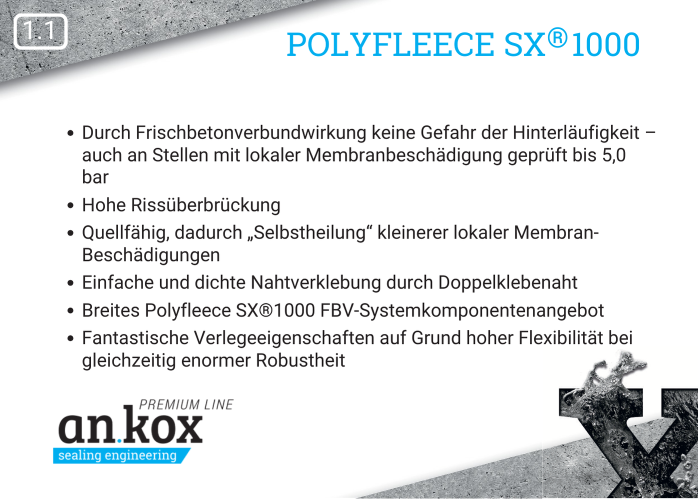 Polyfleece SX® 1000 ist ein hochwertiges FBV-System, das aus mehreren Abdichtungsebenen besteht. Die Verbundwirkung zum Beton wird durch das speziell konzipierte Trägervlies sichergestellt. Neben dem extrem hohen Haftverbund ist die Hinterlaufsicherheit das entscheidende Kriterium. Wird die schützende LDPE-Folie beim Verlegen oder nach der Betonage mechanisch beschädigt, sorgt die polymere Zwischenschicht, die quellfähig ausgestattet ist, für zusätzlichen, zuverlässigen Dichtungsschutz.