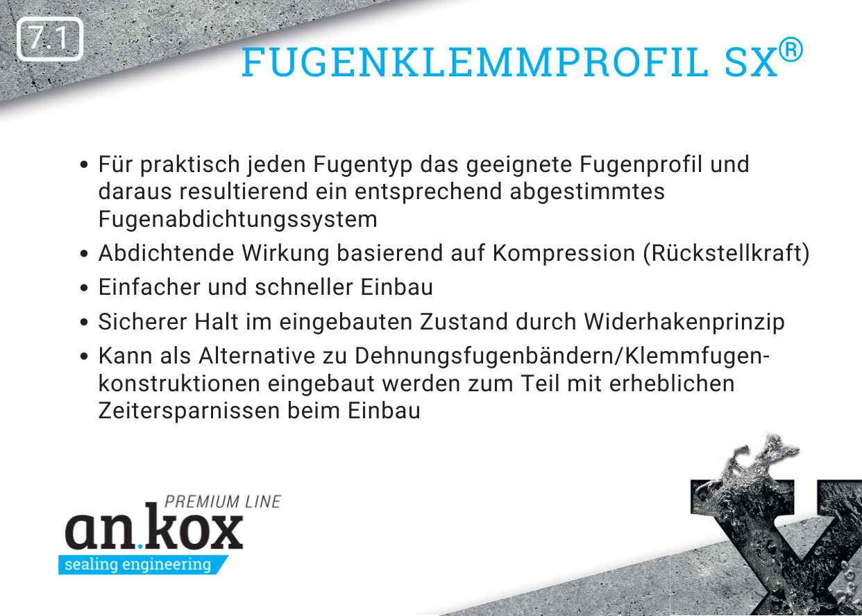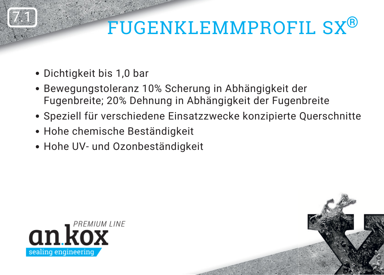 Die spezielle Formgebung macht den Einbau in Bewegungsfugen ohne großen Aufwand möglich, schnell und sicher. Das Profil ist beständig gegen UV-Licht und andere Witterungseinflüsse, außerdem gegen Ozon, Säuren, Basen, Ketone und Alkohole. Für unterschiedlich breite Fugen stehen verschiedene Stärken des Fugenklemmprofil SX® zur Verfügung.