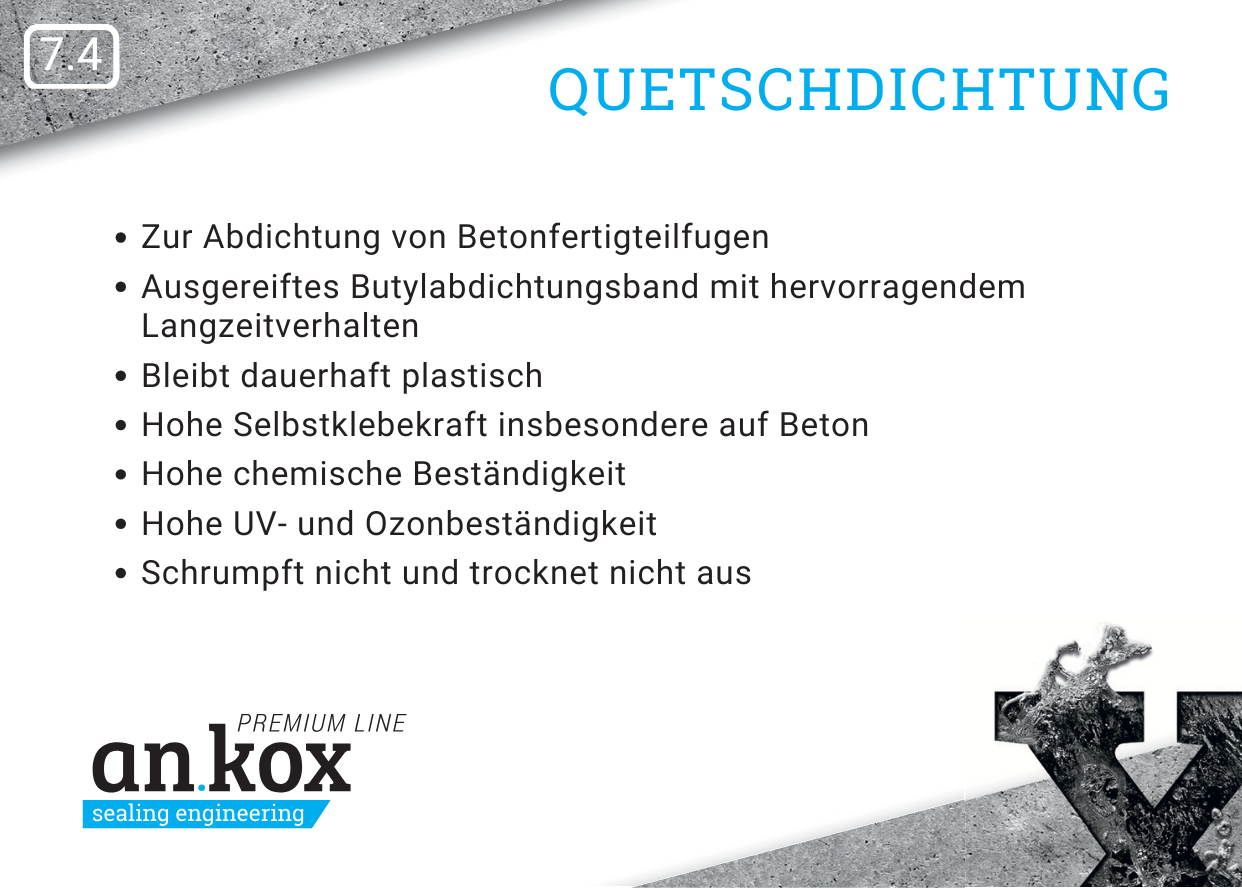 Die an.kox Quetschdichtung ist ein technisch ausgereiftes Butyldichtungsband mit hervorragendem Langzeitverhalten. an.kox Quetschdichtung bleibt dauerhaft plastisch und zeichnet sich durch seine hohe Adhäsion insbesondere auf Betonoberflächen aus. Eine hohe Beständigkeit gegenüber UV und Ozon zeichnen das Dichtungsband ebenso aus, wie seine hohe chemische Beständigkeit gegenüber diversen Substanzen. Die an.kox Quetschdichtung schrumpft nicht, reisst nicht und trocknet nicht aus.