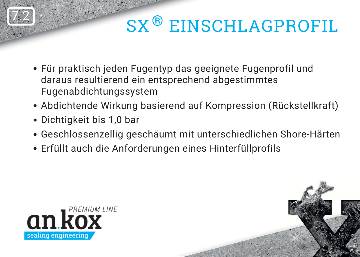 SX® Einschlagprofil wird häufig als Abdichtungs- und Hinterfüllprofil in Kombination mit unserer einkomponentigen Dichtmasse FlexproofX® 1 eingesetzt. Der Einbau erfolgt in Anlehnung an die DIN 18540-F.