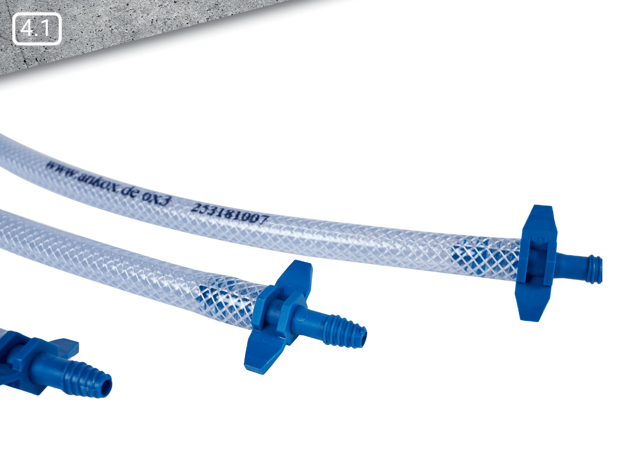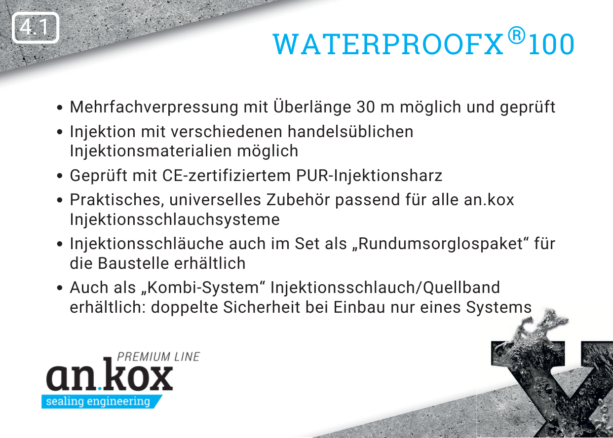 WaterproofX® 100 bietet Vorteile durch eine Raffinesse der Gestaltung: Durch den patentierten geschäumten Kern und den wabenförmige Querschnitt liegt der Injektionsschlauch stabil auf der Unterlage und sorgt für ein optimales Verhältnis von Wandmaterial zu Volumen. Eine Mehrfachverpressung ist möglich. Es gibt keine Einschränkungen bei der Wahl des Injektionsmaterials (PUR-Schaum, PUR-Harz, Epoxidharz, Polymer-Gelmatrix/ Zement). Überlängen sind problemlos möglich (geprüft bis 30 m).