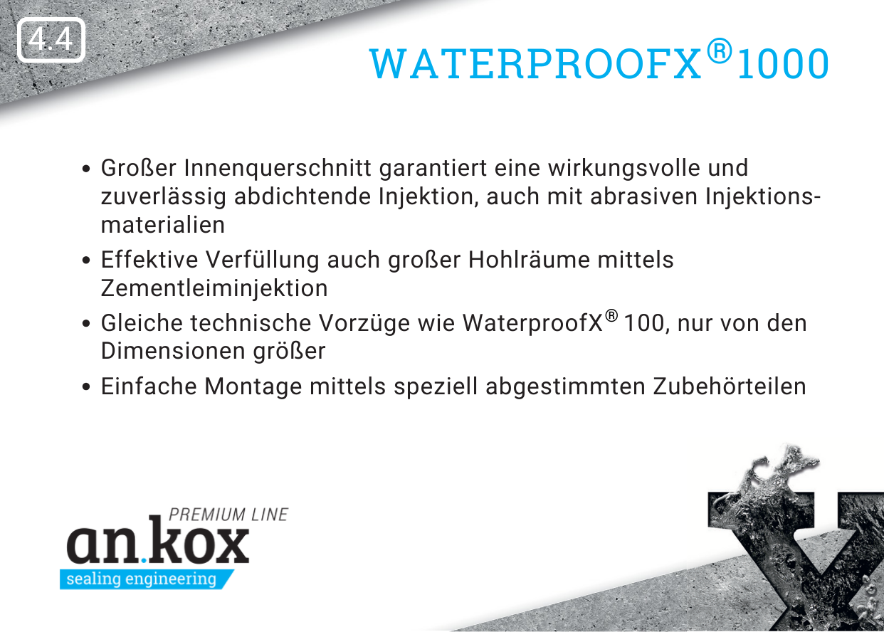 Durch den besonders großen Innenquerschnitt empfiehlt sich der WaterproofX® 1000 vor allem für technisch anspruchsvolle Injektionen mit abrasiven, mineralischen Injektionsmaterialien. Die ausgeklügelte Außen- und Innengeometrie entspricht in den Vorteilen dem kleinen Vorbild, dem WaterproofX® 100.