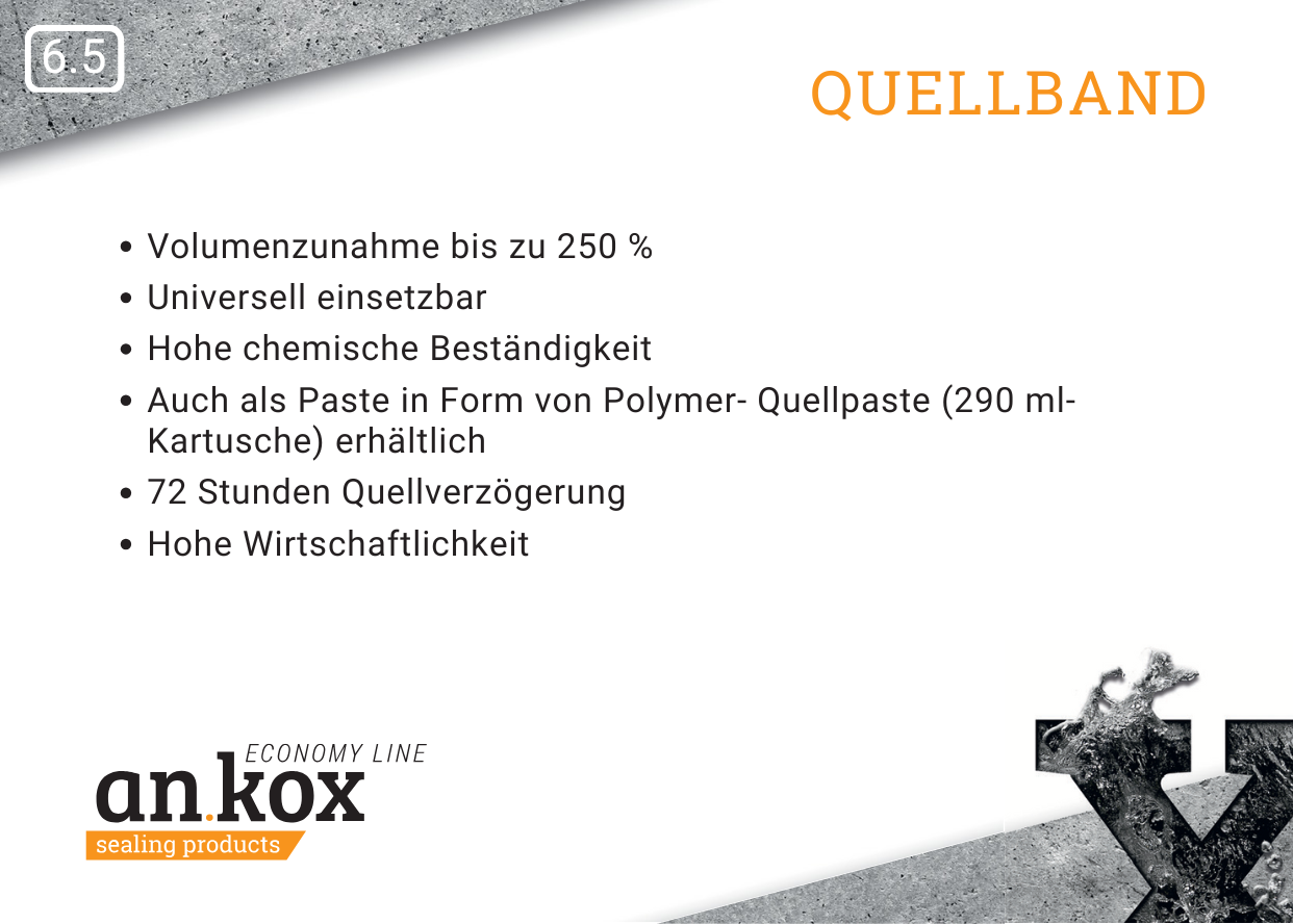 Das Quellband aus thermoplastischem Elastomer (TPE) dichtet bei Kontakt mit Wasser durch Quelldruck, wobei die Quellung mit Verzögerung einsetzt. Formbeständig, dauerelastisch und temperaturbeständig. Seine Resistenz gegen zahlreiche Chemikalien macht es sehr vielseitig einsetzbar. Für jeden Fugentyp gibt es ein passendes Profil. Als innenliegende Arbeitsfugenabdichtung sind die SwellproofX® 1 -Profile hervorragend geeignet. Die Profile in den Größen 20 x 5 mm und 20 x 10 mm sind auch als Salzwasser-Variante lieferbar. Auf Anfrage sind auch jederzeit andere Profilformen möglich.